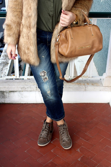Para dar um up no conjunto juntei este casaco de pêlo falso, com uma cor super neutra que dá com tudo. Usei uma mala em bege num modelo baú e uns ténis num tom dourado esverdeado que deram um toque mais casual ao outfit. Espero que gostem, beijinhos.