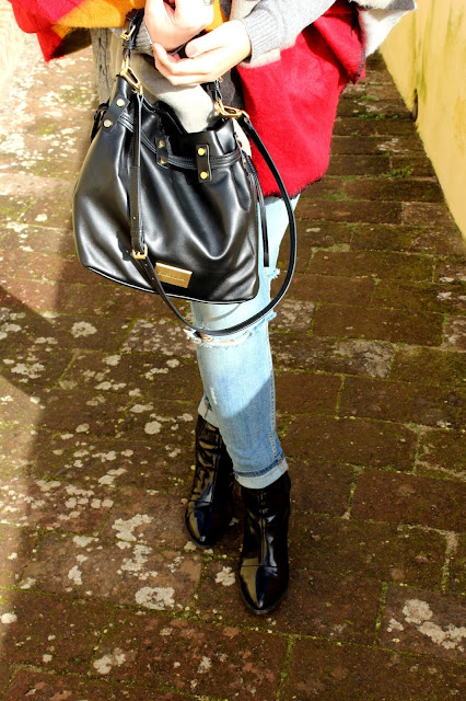 Para fazer esta conjugação usei uma camisola cinza simples bem quentinha e juntei uns destroyed jeans de ganga clara, que deram um toque cool ao outfit. Depois juntei este lenço, e usei-o como poncho, dando mais cor e vida ao look. A mala e os botins em preto vieram dar sofisticação a esta conjugação. Espero que gostem, beijinhos.